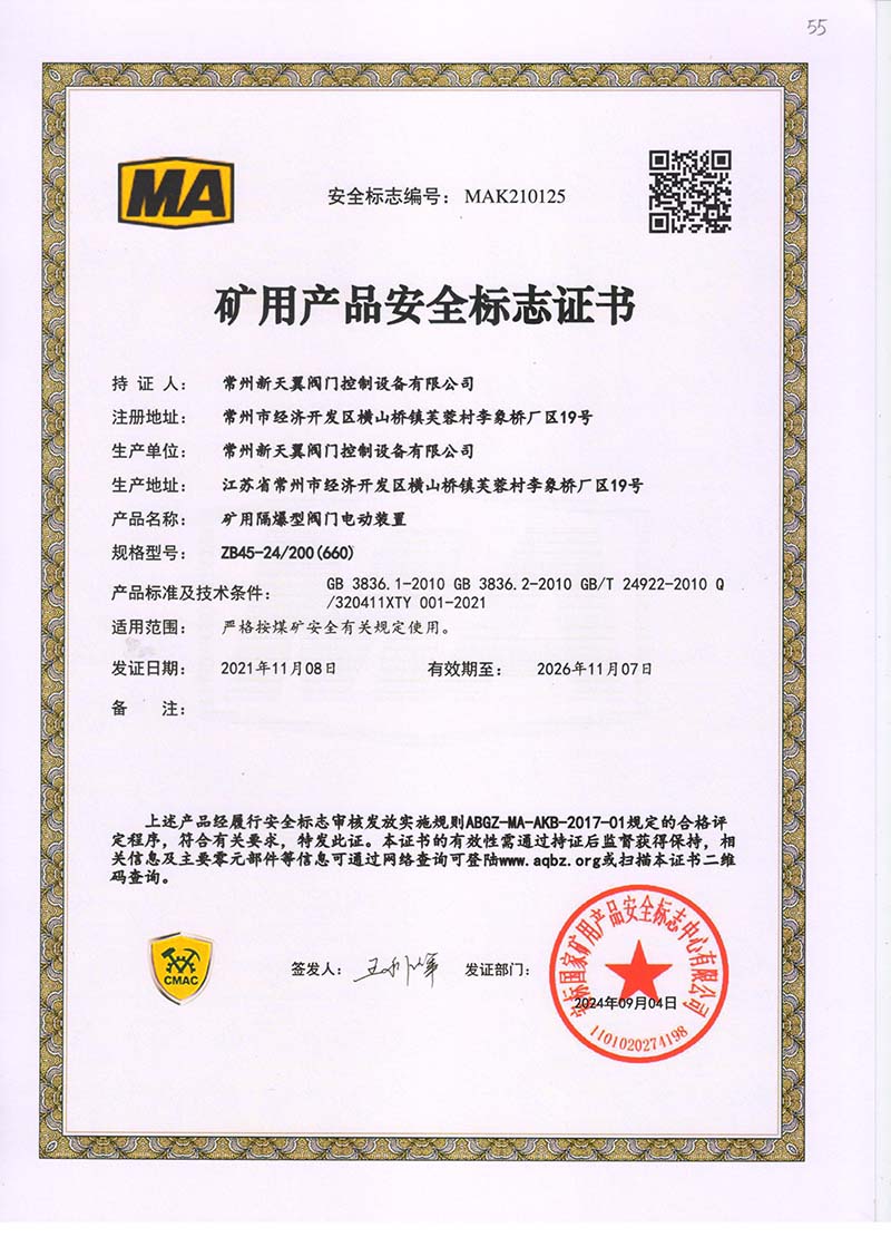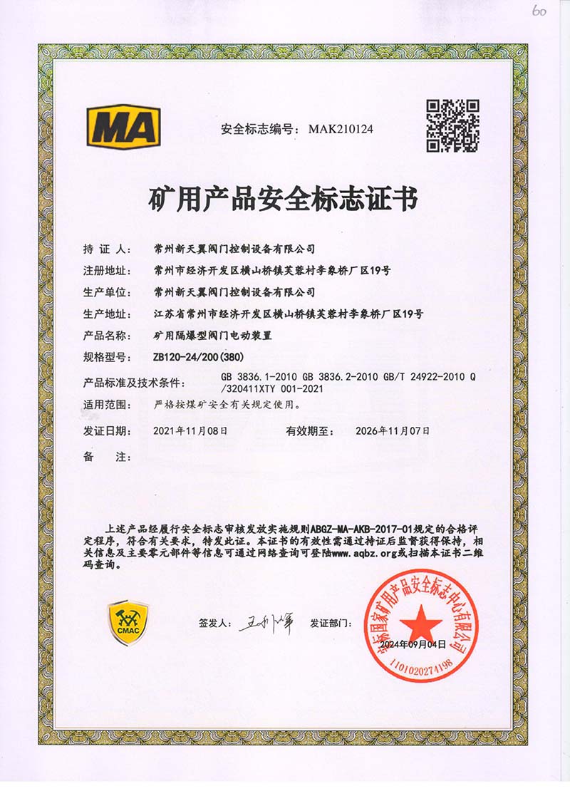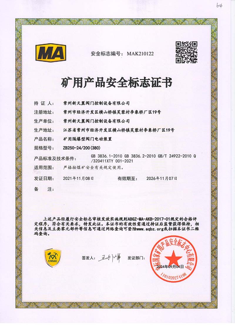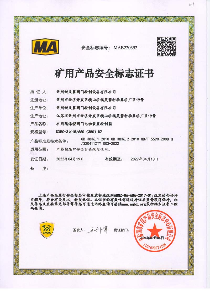 礦用隔爆ZB10-24中國國家強制性產品認證證書110.1