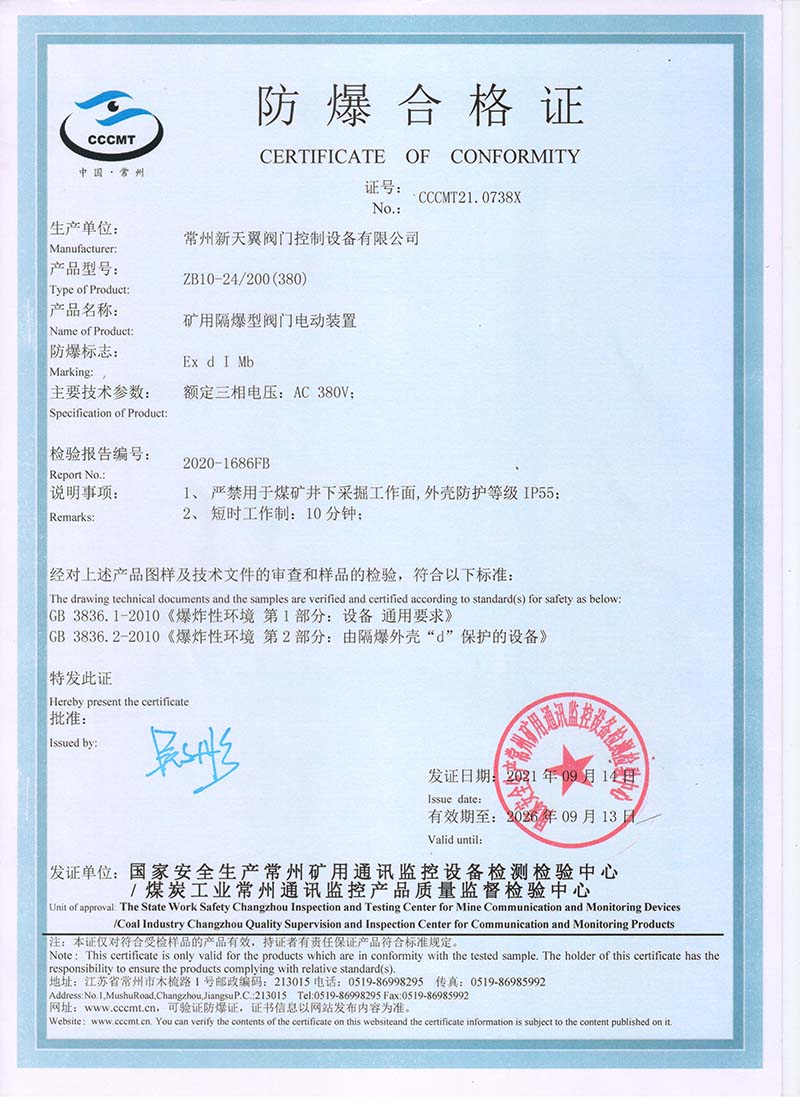 隔爆型DZB 中國國家強制性產品認證證書108.2